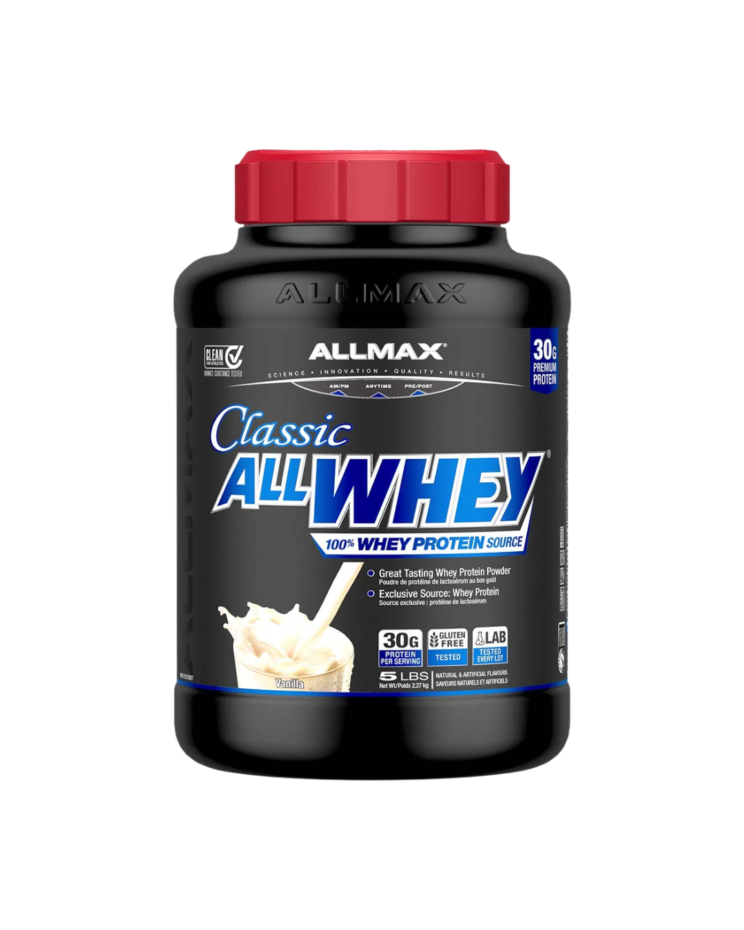 Classic AllWhey 100% Whey Protein est un concentré de protéines de lactosérum de qualité supérieure mélangé à l'isolat de protéine de lactosérum fournissant 30 g de protéines ; testé et garanti ! AllWhey fournit une protéine propre, complète et entière sans gluten fabriquée à partir de la meilleure source ; 100 % de protéines de lactosérum !