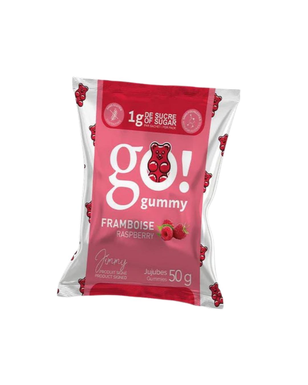 Gummy bears à très faible teneur en sucre (≈1 g par sachet de 50 g), riches en fibres, véganes et sans gluten.