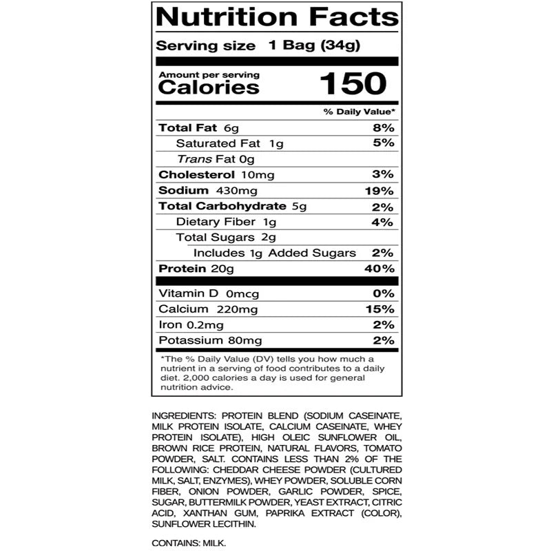 150 calories par sachetDélicieuse saveurs avec une nutrition incroyableSoufflés, jamais fritsSans gluten et adaptés au régime cétogèneSans arômes artificiels, édulcorants ni colorants