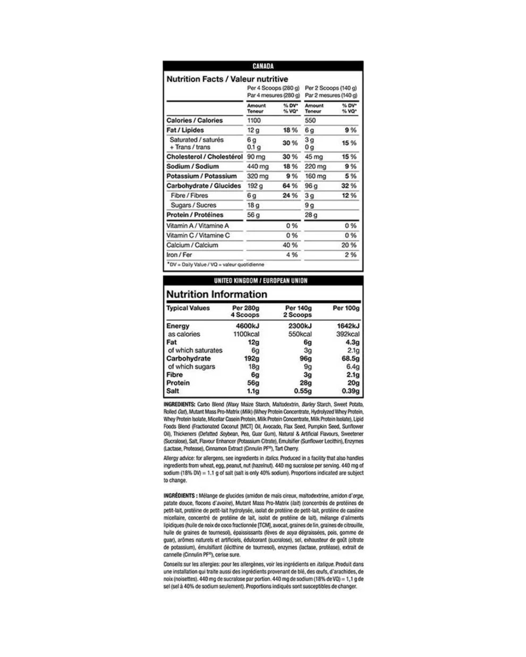 MUTANT MASS contient 1100 calories par portion, dont 56g de protéines pures, 192g de glucides propres, 12g de lipides, 26.1g d'EAA et 12.2g de BCAA naturellement présents. Il est fabriqué avec des acides gras essentiels, des aliments entiers et naturels (orge, patate douce, flocons d'avoine) ainsi que des huiles naturelles (avocat, huile de noix de coco, graines de lin, graines de citrouille et huile de tournesol.