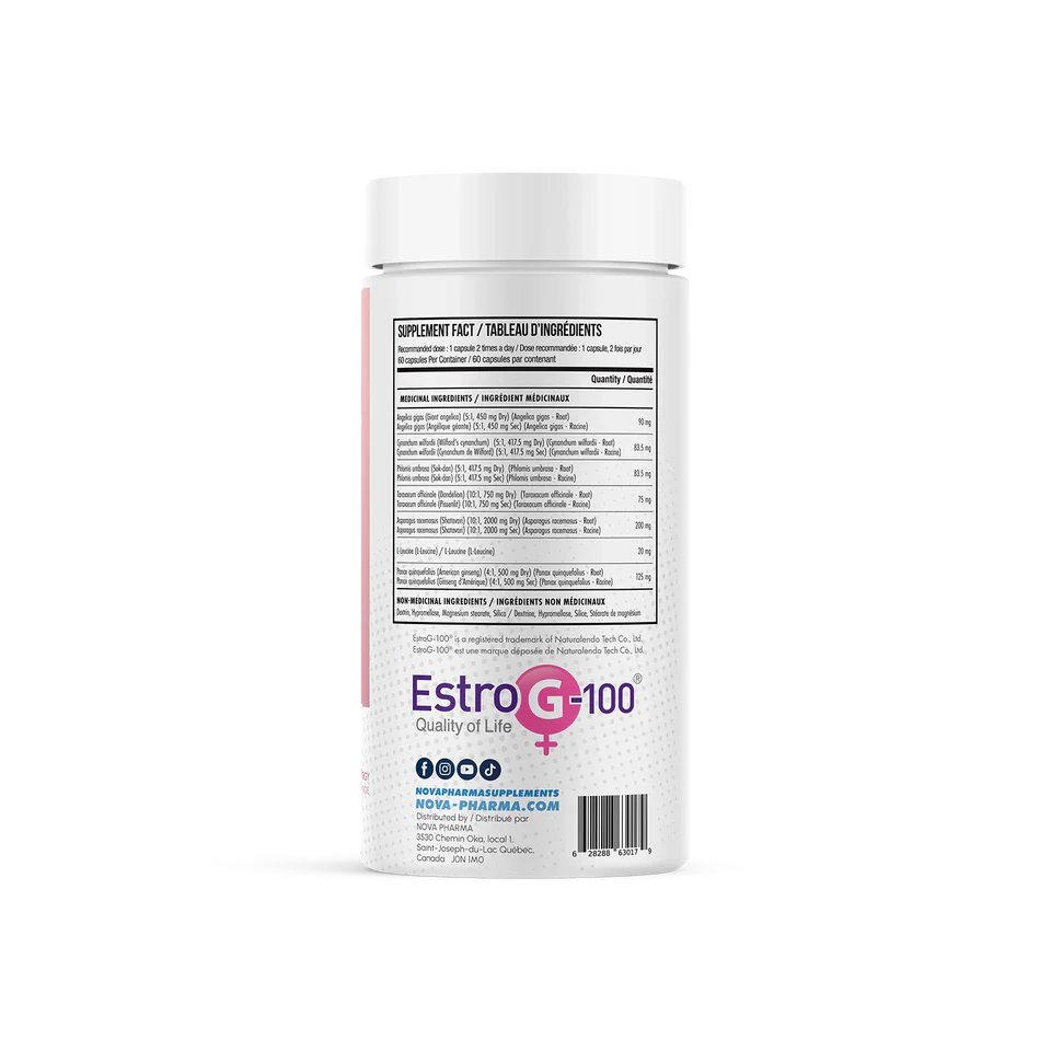 EstroG‑100™, un extrait végétal cliniquement étudié issu notamment de Angelica gigas, Cynanchum wilfordii, Phlomis umbrosa, Pissenlit et Shatavari, enrichi en L‑Leucine et ginseng américain, pour accompagner l’équilibre hormonal et préserver la masse musculaire.