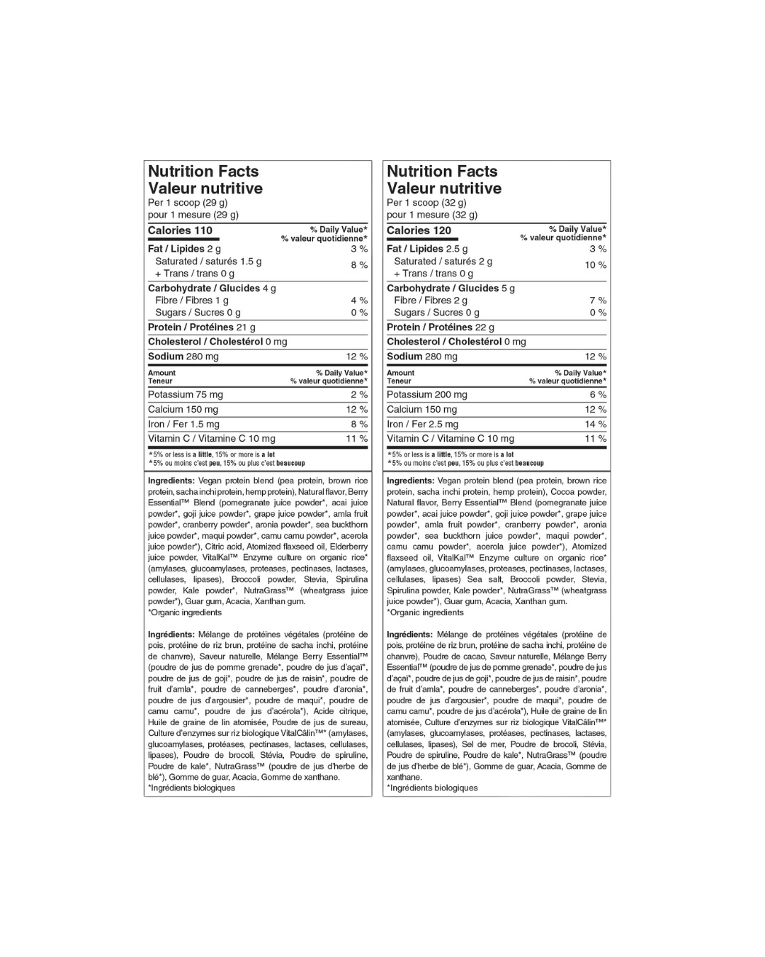 21 g de protéines par portion provenant de petits pois,riz brun,Sacha Inchi, et chanvre. Enrichi avec des superaliments biologiques comme grenade, açaï, et goji, il est rempli d'antioxydants,Vitamine C et riche en nutriments légumes verts comme chou frisé et spiruline. Avec 85% d'ingrédients biologiques, cette formule hypocalorique et sucrée à la stévia soutient la santé musculaire, l'immunité, et la digestion. Parfait pour votre bien-être quotidien.