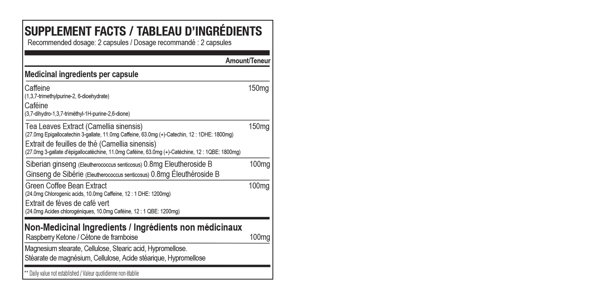 Caféine naturelle et extrait de feuilles de thé (Camellia sinensis) (~150 mg de caféine + EGCG) pour stimuler l’énergie et la vigilance.
