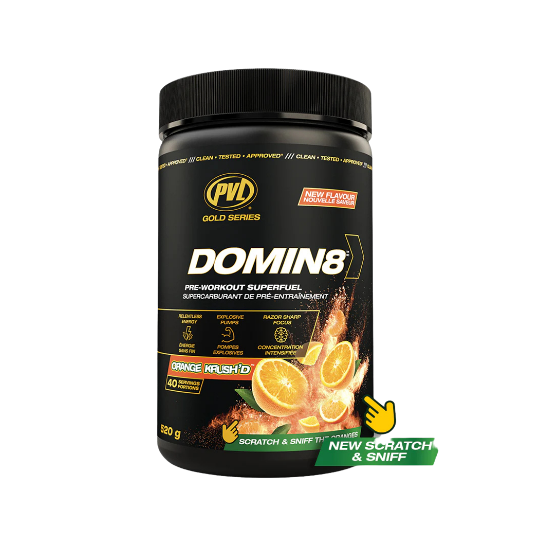 Voici le pré-entraînement DOMIN8. Un complexe de 8 ingrédients essentiels, entièrement chargé pour fournir une énergie euphorique et une concentration qui établit un nouveau standard. Il est temps d'y aller, de conduire, de s'énergiser, de soulever, de pousser et d'aller jusqu'au bout comme jamais auparavant ! Vous n'êtes plus qu'à une mesure ! LA GRANDEUR VOUS ATTEND. DOMIN8.