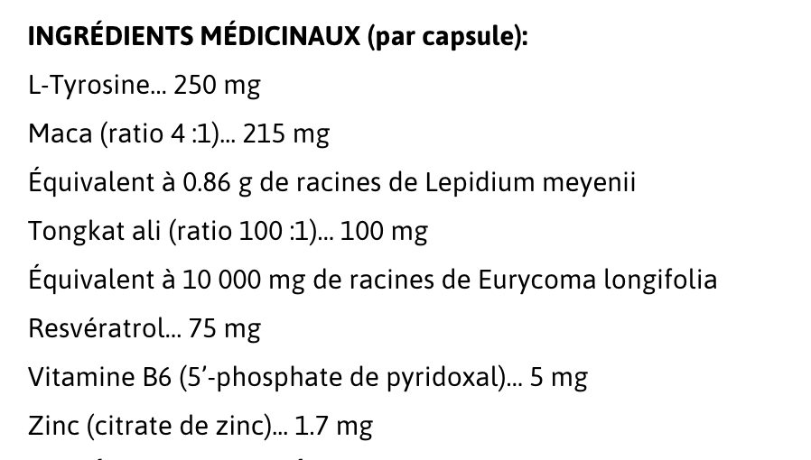 Le maca, pour sa part, joue un rôle important sur la santé du système hormonal. La tyrosine et la B6 viennent compléter le mélange et permettent un meilleur équilibre des neurotransmetteurs (comme la dopamine et la sérotonine).