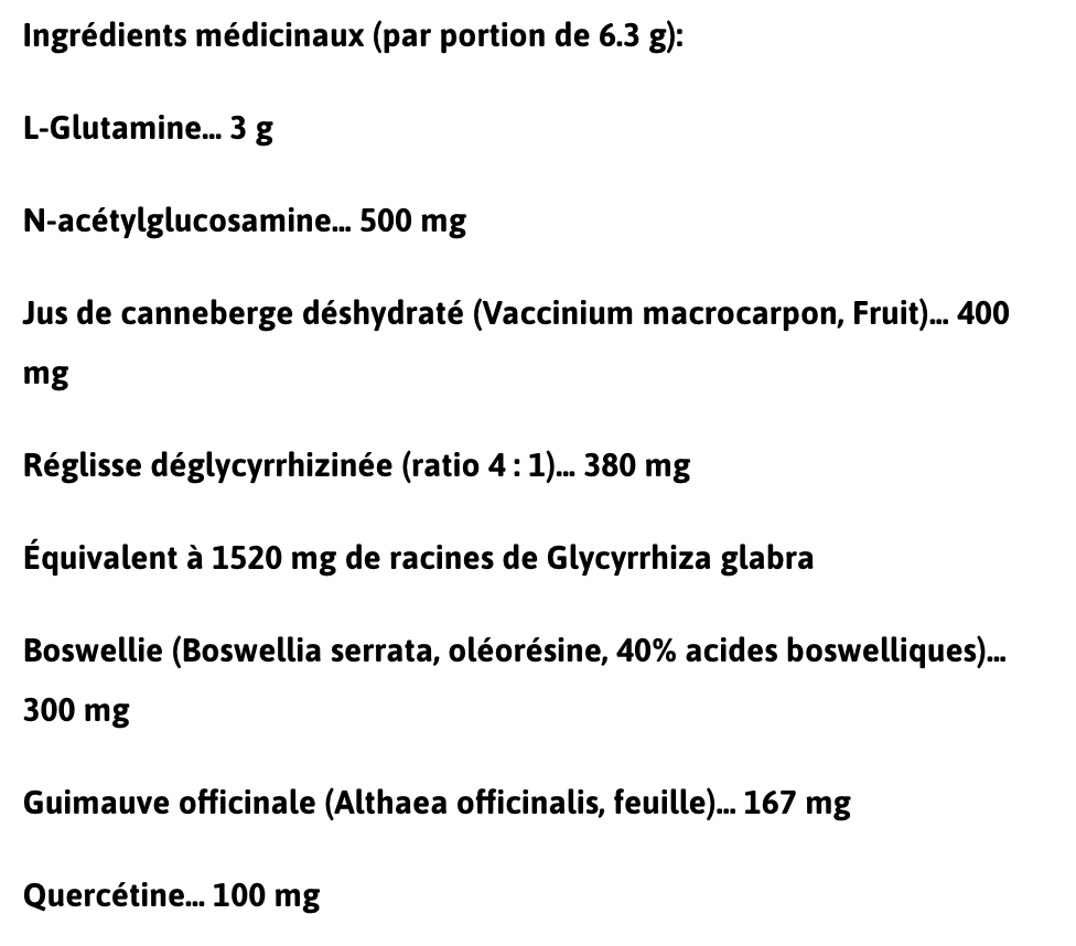 La formulation exclusive Regen-X agit sur plusieurs aspects simultanément afin d’aider à réduire l'inflammation et favoriser la guérison de votre estomac et votre tube digestif. Un autre aspect à considérer est que toutes ces conditions (colite ulcéreuse, la maladie de Crohn's, la perméabilité intestinale accrue, +) sont accompagnées de débalancement de la flore intestinale, nous avons donc ajouté des polyphénols pour favoriser la croissance de bactéries (aideront à rétablir l'homéostasie en travaillant directement sur les populations bactériennes de votre microbiote intestinale).